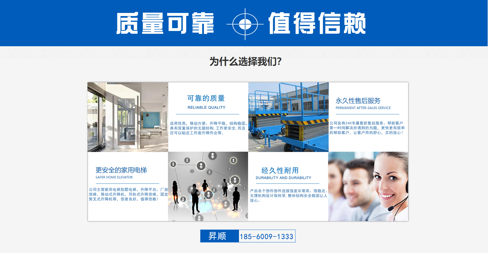 山東昇順液壓升降機械有限公司是一家主營家用電梯,別墅電梯,升降平臺,廠房貨梯,移動式升降機,導軌式升降貨梯,固定剪叉式升降機等產(chǎn)品企業(yè),質量可靠,值得信賴?! ∮脩糁辽?,以用戶為中心”是公司永遠堅持的服務宗旨,贏得用戶的贊許是我們的榮譽,及時滿足用戶的需求,是我們公司的愿望。長期以來,公司員工以優(yōu)質的服務,取悅于用戶,以誠信的言行取信于用戶,得到了用戶們的好評。我們期待著與您更加愉快的合作!公司的發(fā)展,離不開社會的大力支持,在社會的支持和幫助下,我們正昂首闊步邁向未來! 我們的經(jīng)營方針是:以質量求生存,以產(chǎn)品求發(fā)展,以信譽保合作,以服務贏客戶?! ”竟緦Ξa(chǎn)品質量和各項服務恪守合同承諾,并愿與新老客戶精誠合作,共創(chuàng)未來?! 」揪瘢簞?chuàng)新是主題,超越是不懈的追求?! 」咀谥迹盒抛u保證,誠信為本。 我們會以合理的價格,良好的信譽,雄厚的實力,優(yōu)質的產(chǎn)品,最周到的服務,服務于廣大新老客戶!...